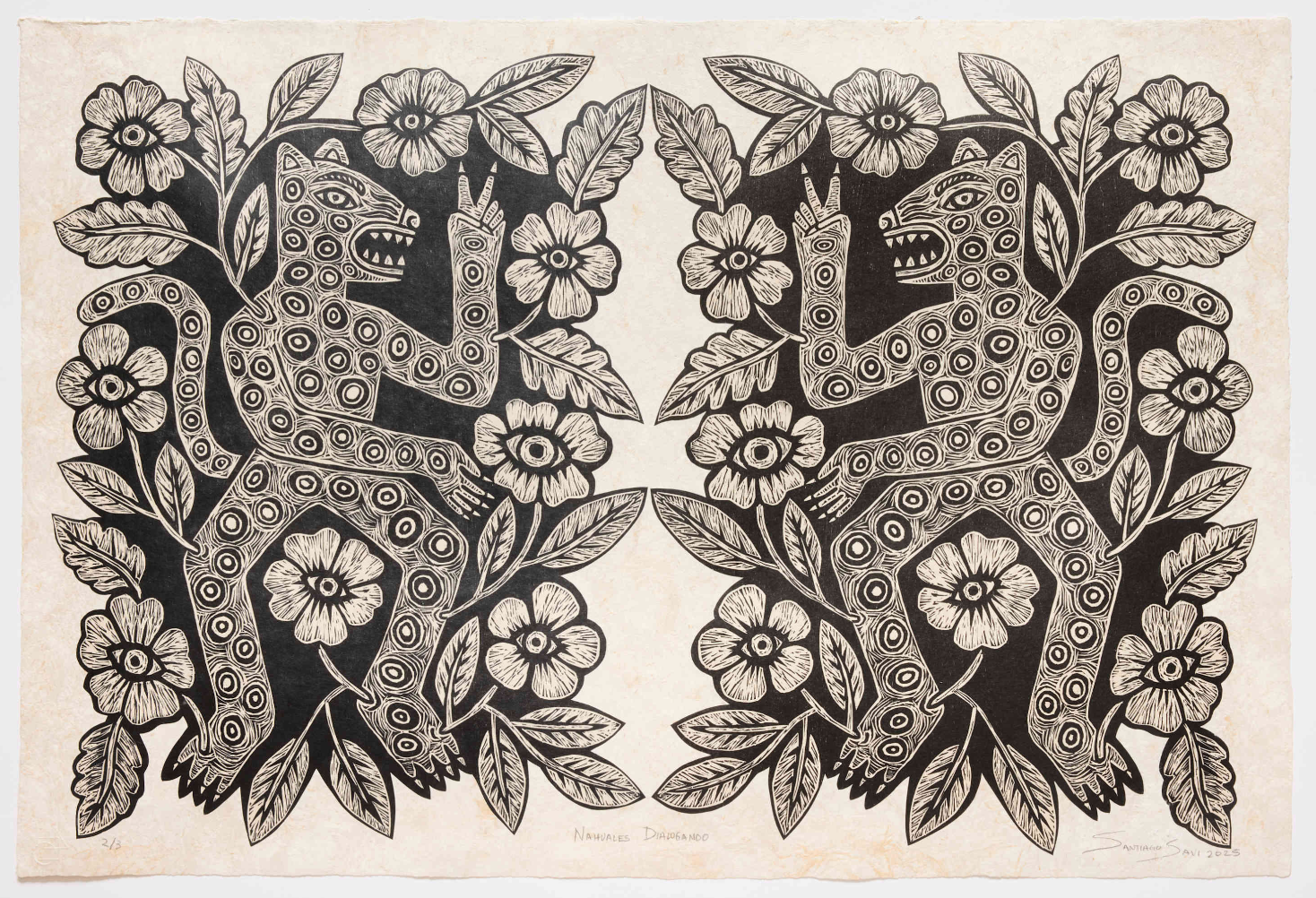 Santiago Savi. Mujer con Mascara de Muerte Ofrendando Copal y Vela 1, Monotype on traditional Amate paper, 31.5 x 24.5 in.