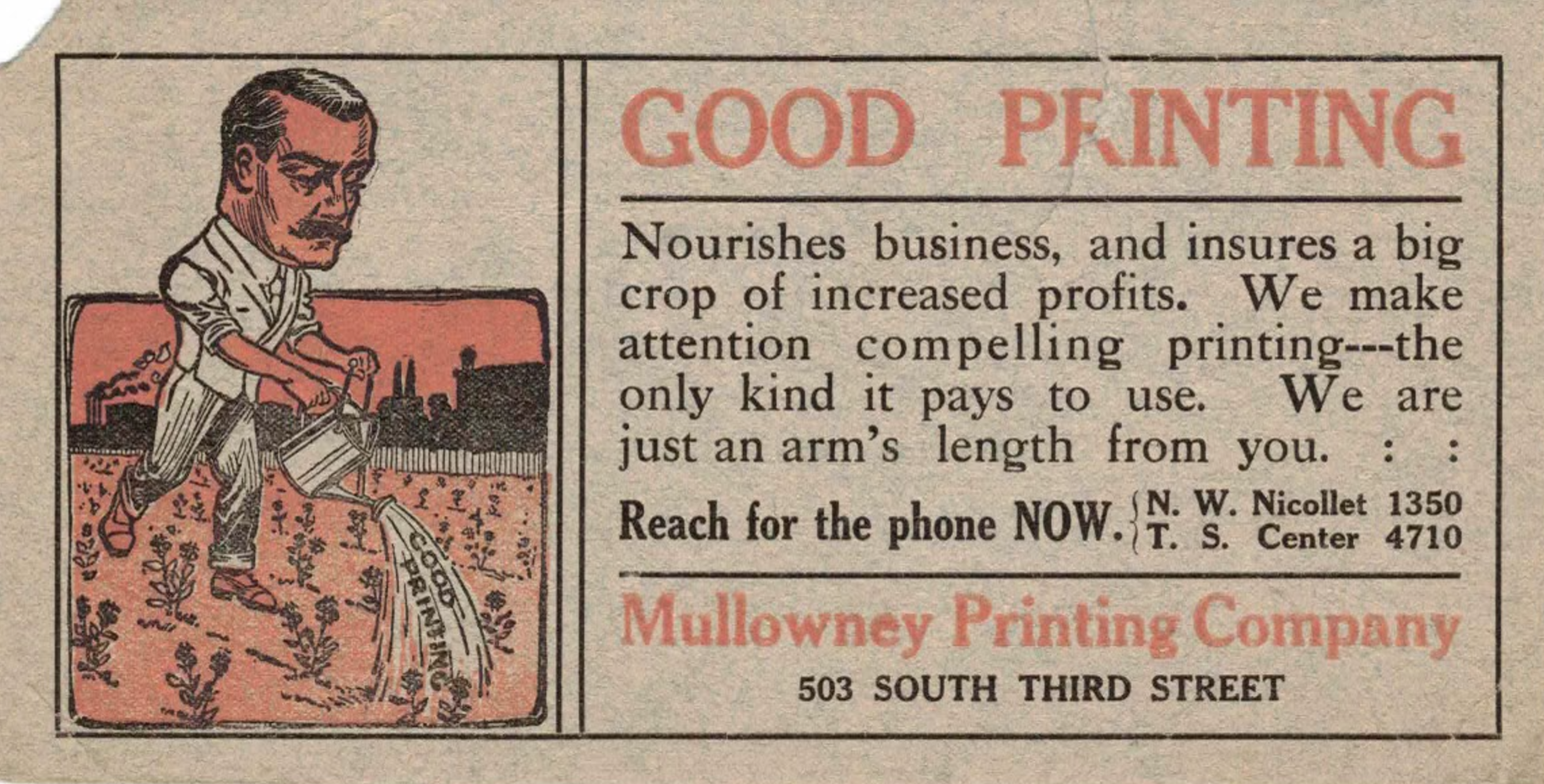 Mullowney Printing, founded by Paul Mullowney, traces its roots back to his grandfather J.D. Mullowney’s commercial print studio, established in the early 1900s in Minneapolis. The original studio specialized in traditional commercial printing techniques, including patented window ad displays (Patent October 1926) and marketing materials. It did not survive the labor disputes and economic turmoil of the Great Depression and ceased operations circa 1929.